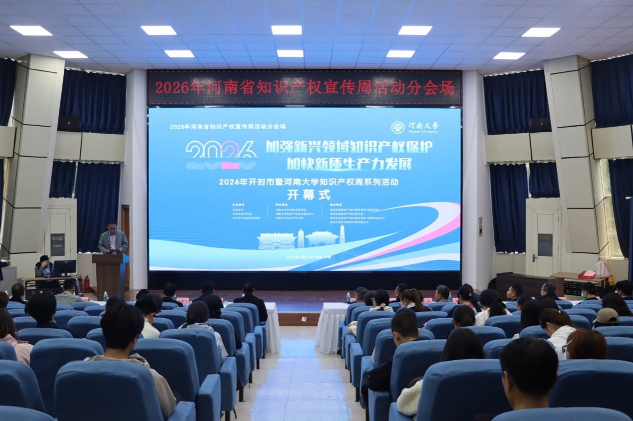 4月21日上午,2026年开封市暨河南大学知识产权周系列活动开幕式在河南大学金明校区锥形报告厅举行。本次活动以“加强新兴领域知识产权保护加快新质生产力发展”为主题,由河南大学、开封市委宣传部、开封市市场监督管理局联合主办,河南大学科学技术研究院、知识产权信息服务中心和法学院(知识产权学院)共同承办,旨在普及知识产权知识,推动知识产权转化运用,助力区域创新发展与新质生产力培育。开封市委宣传部、开封市市场监督管理局、开封市教育局、开封市人民检察院、开封市中级人民法院等单位相关领导,河南大学图书馆、科学技术研究院、法学院(知识产权学院)部门负责人,以及知识产权服务机构代表、师生代表等百余人共同参加开幕式。开幕式由学校科技成果转移办公室主任李君勇主持。