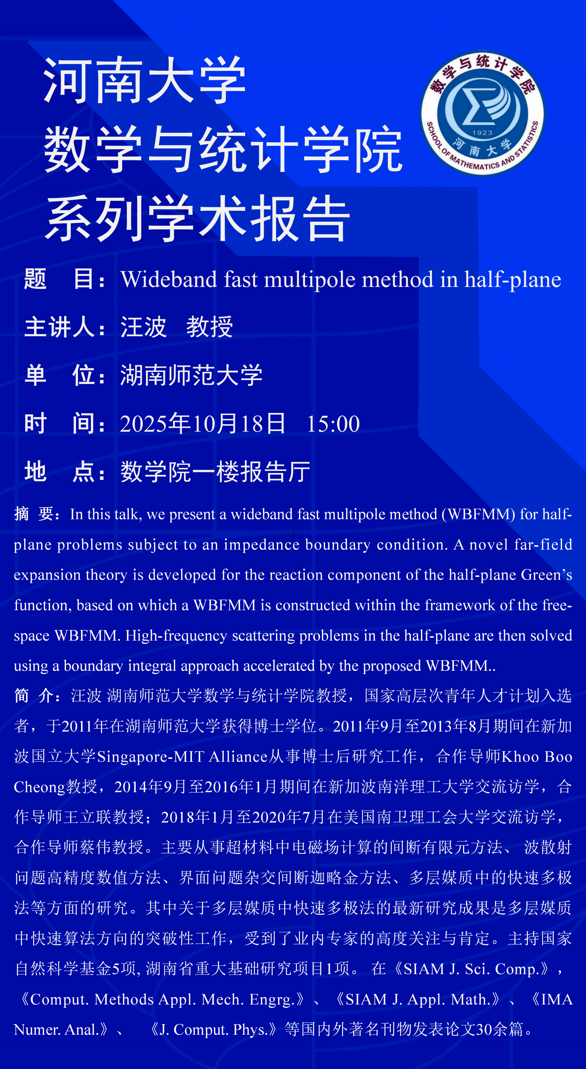 汪波:Wideband fast multipole method in half-plane(时间:10月18日)