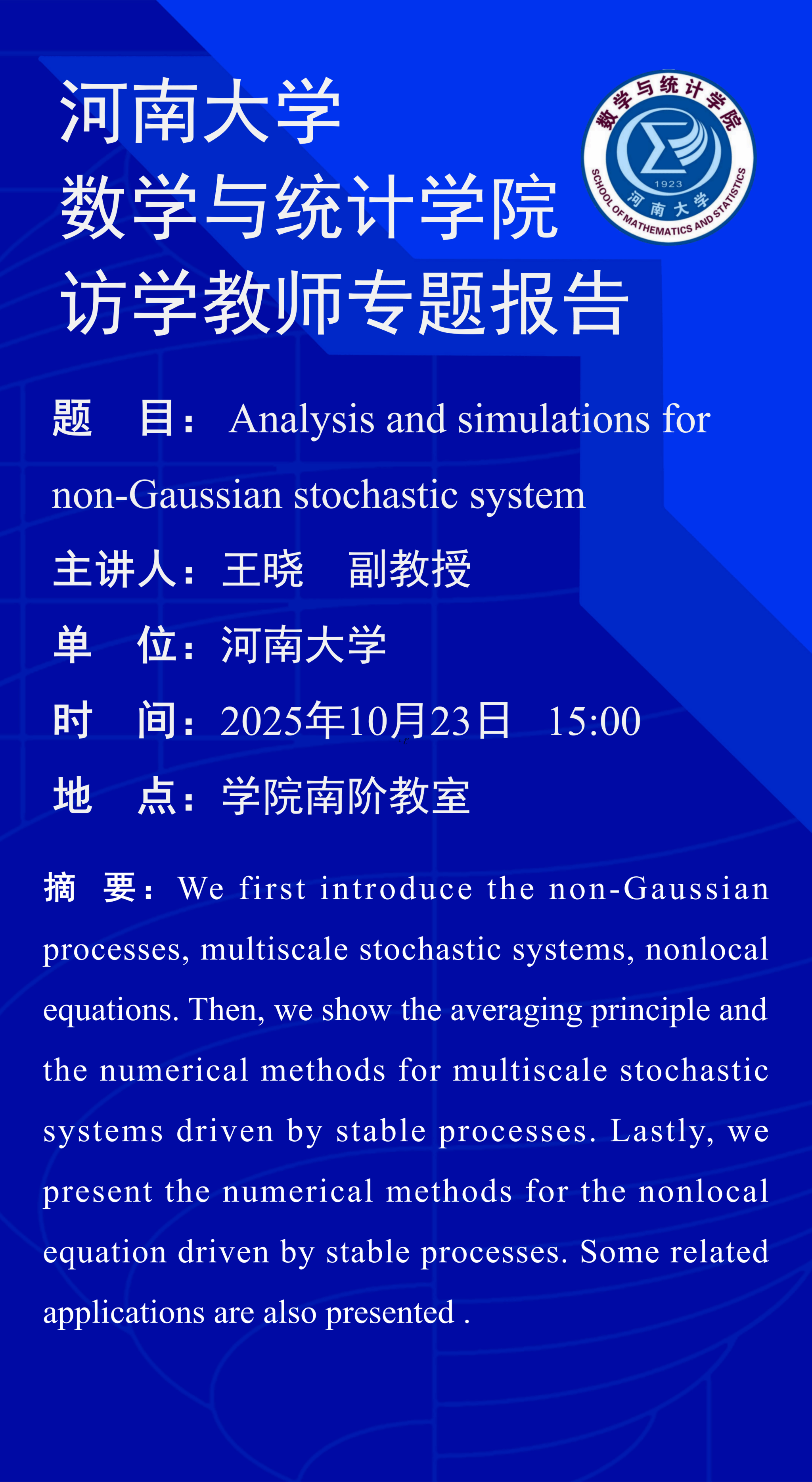 王晓:Analysis and simulations for non-Gaussian stochastic systems(时间:10月23日)