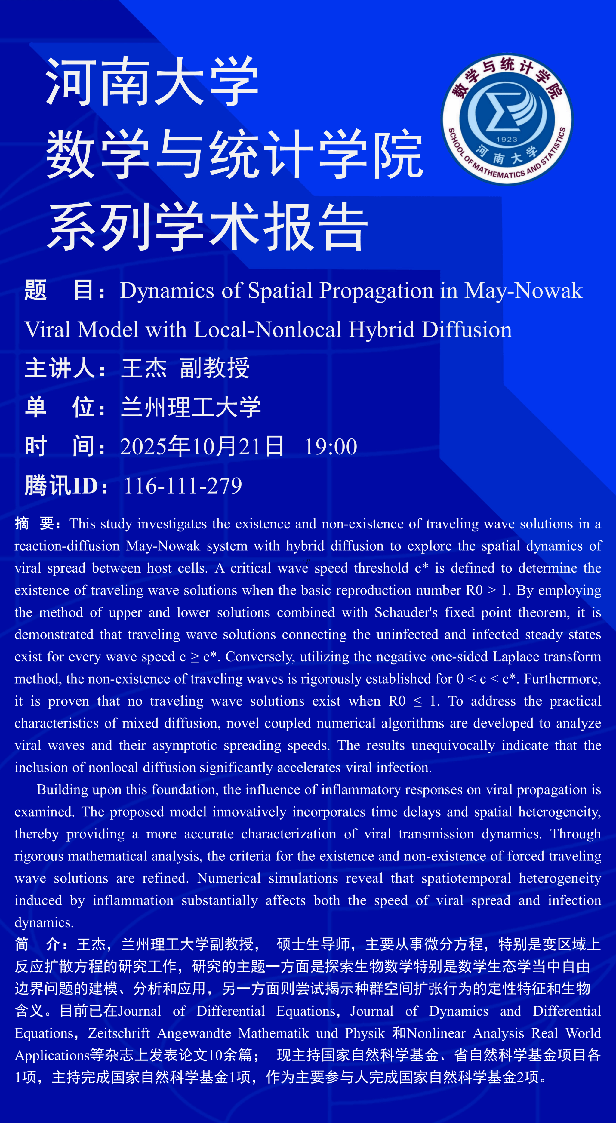 王杰:Dynamics of Spatial Propagation in May-Nowak Viral Model with Local-Nonlocal Hybrid Diffusion(时间:10月21日)