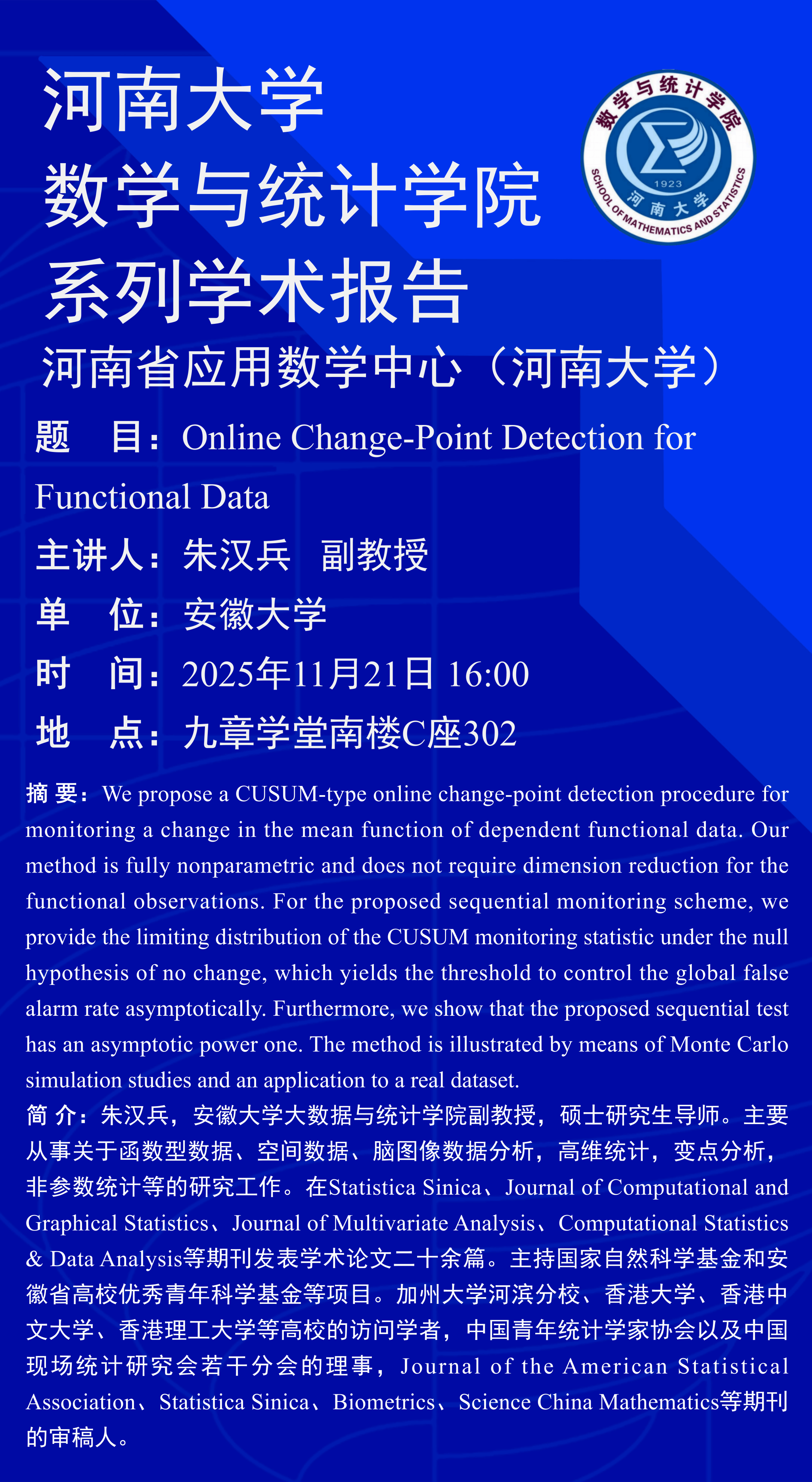 朱汉兵:Online Change-Point Detection for Functional Data(时间:11月21日)