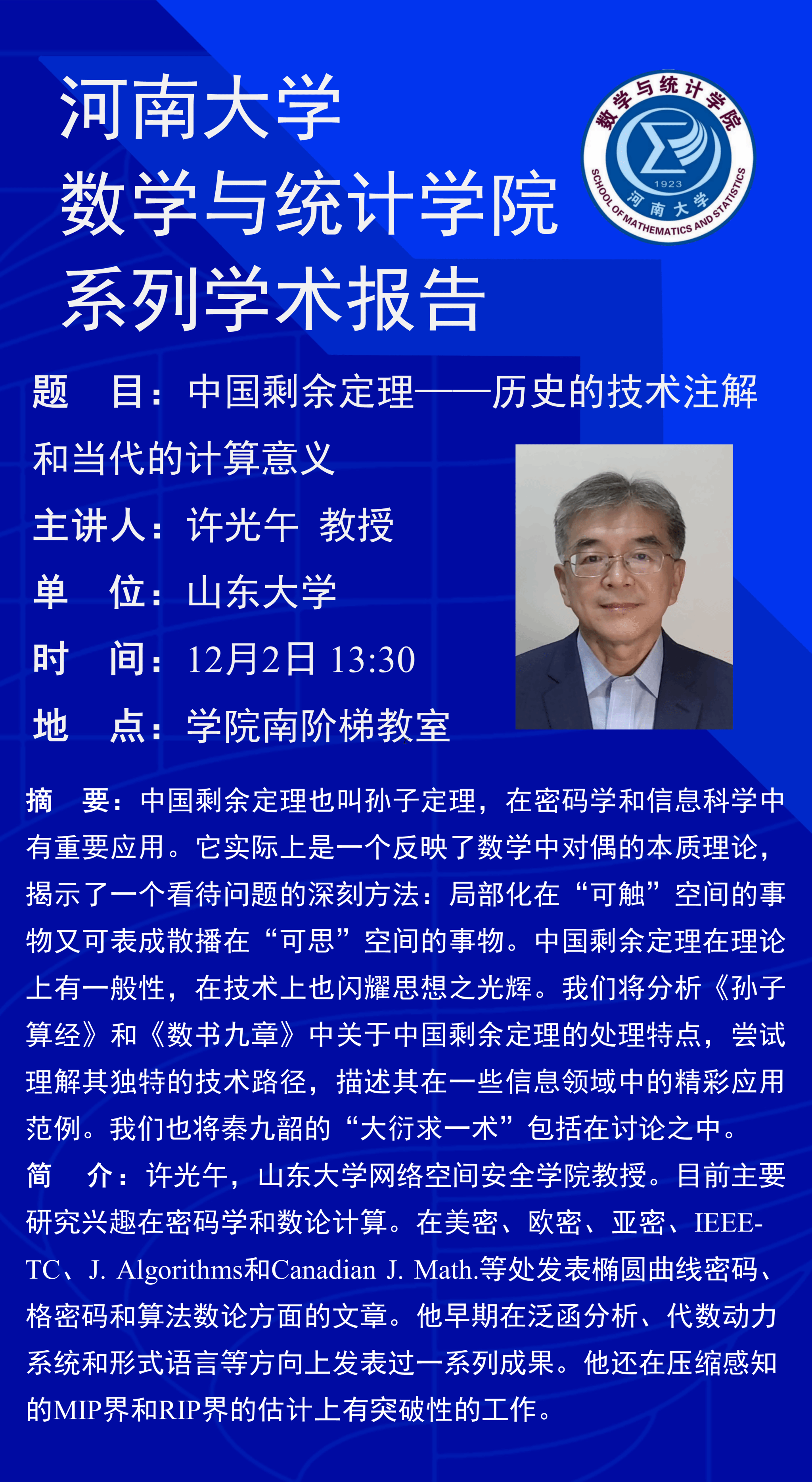 许光午:中国剩余定理—历史的技术注解和当代的计算意义(时间:12月2日)