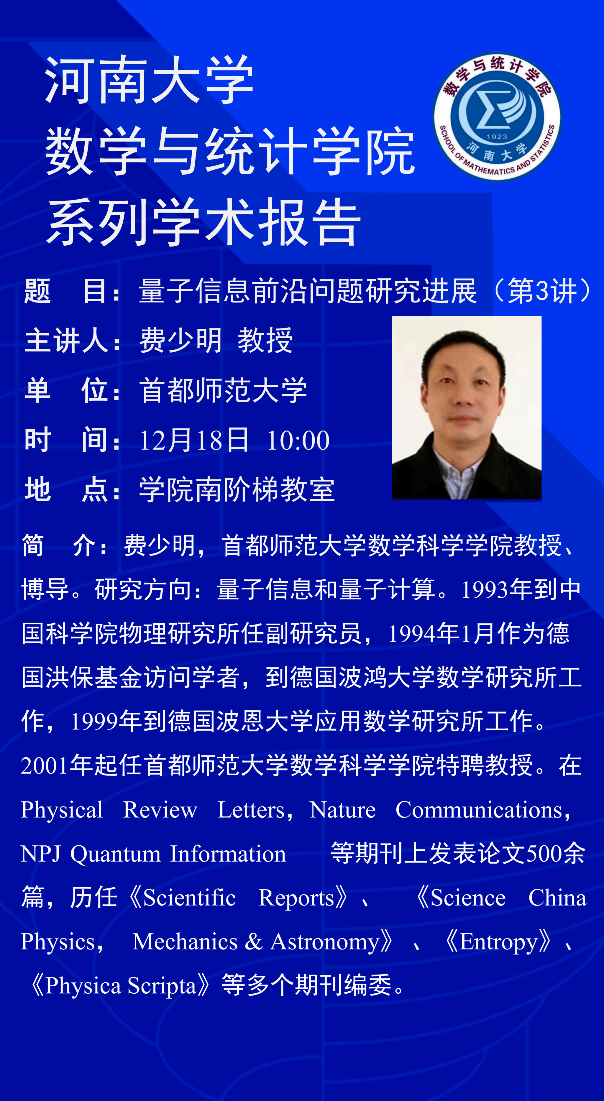 费少明:量子信息前沿问题研究进展(第3讲)(时间:12月18日)