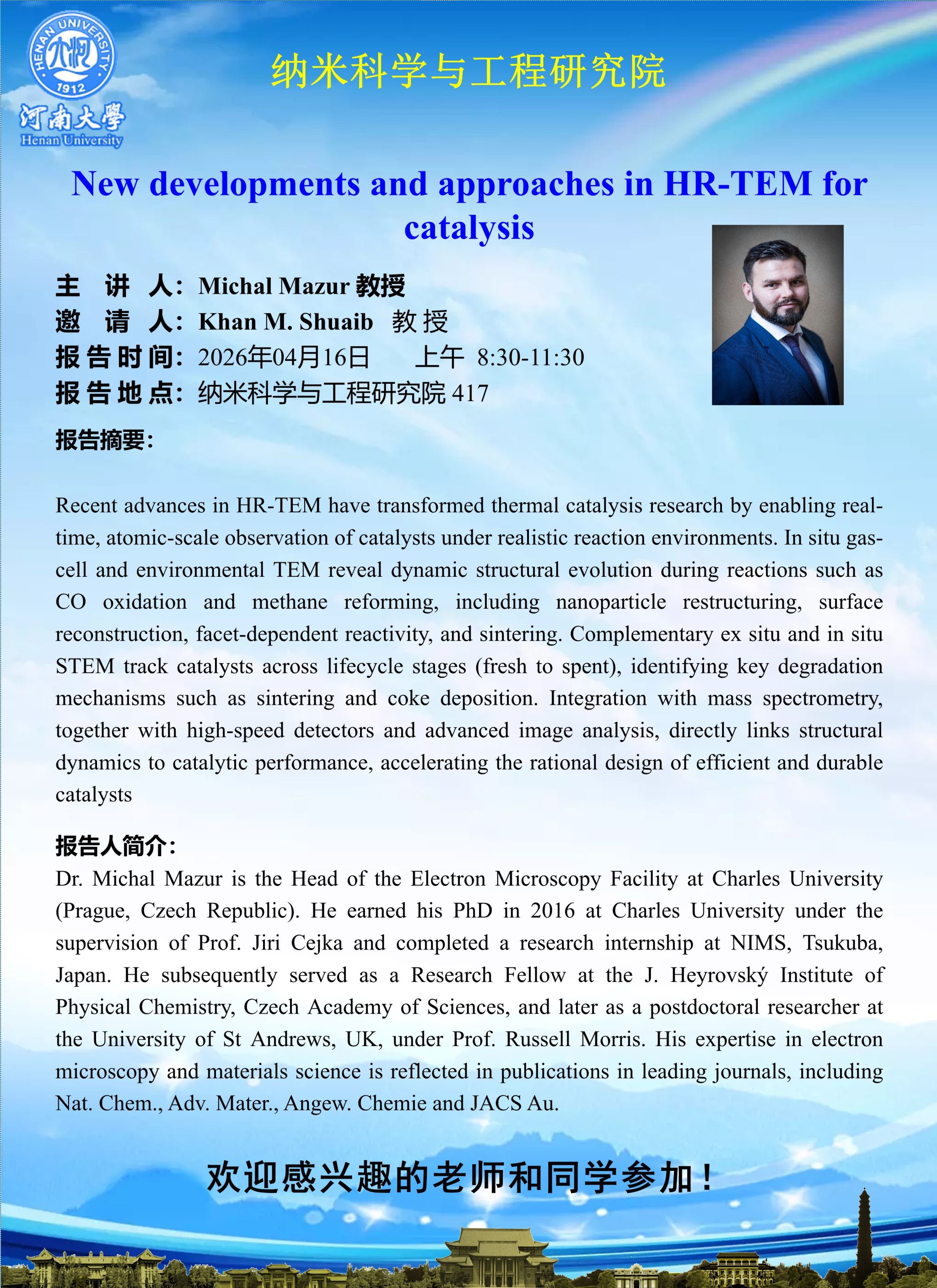 Michal Mazur:New developments and approaches in HR-TEM for catalysis(时间:4月16日)
