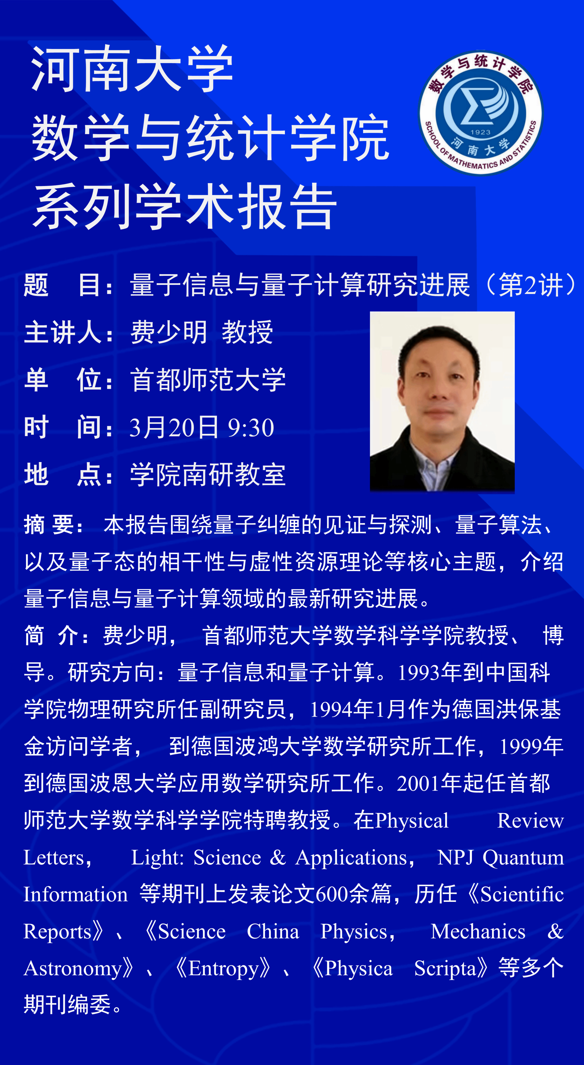 费少明 :量子信息与量子计算研究进展(第2讲)(时间:3月20日)