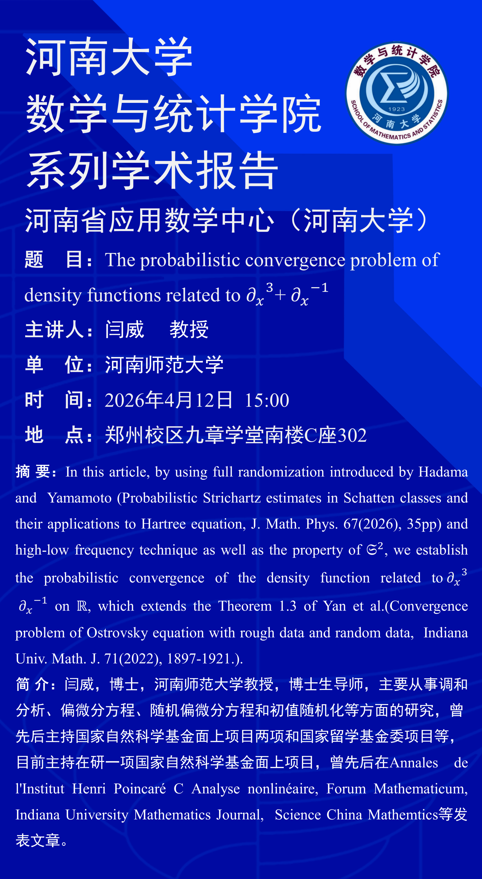 闫威:The probabilistic convergence problem of density functions related to ∂_x^3+ ∂_x^−1(时间:4月12日)