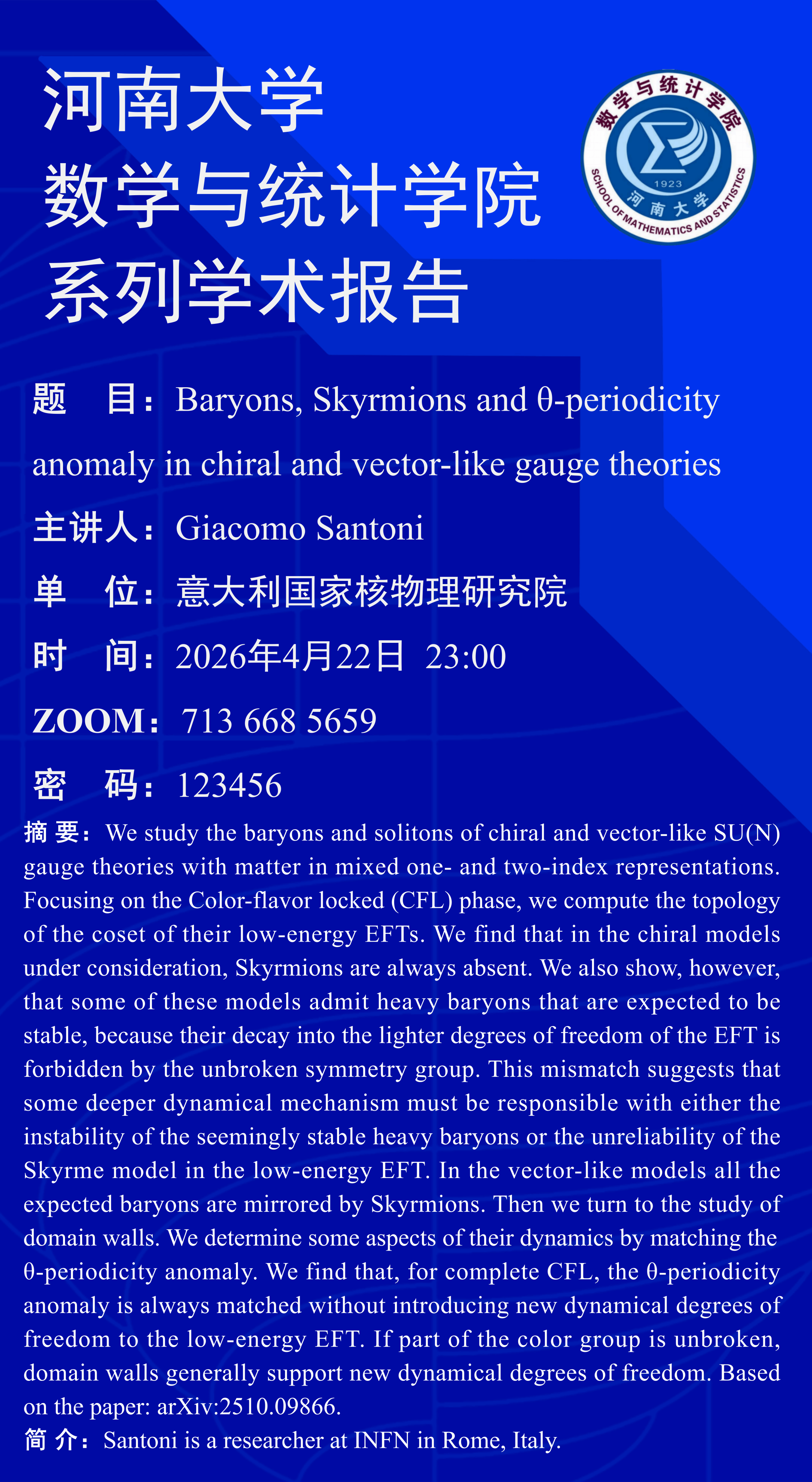 Giacomo Santoni:Baryons, Skyrmions and θ-periodicity anomaly in chiral and vector-like gauge theories(时间:4月22日)