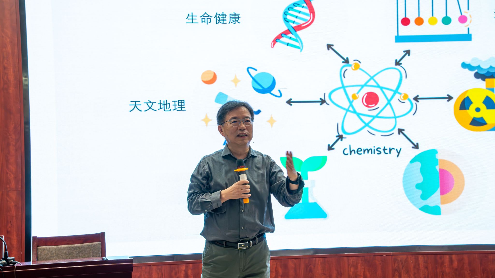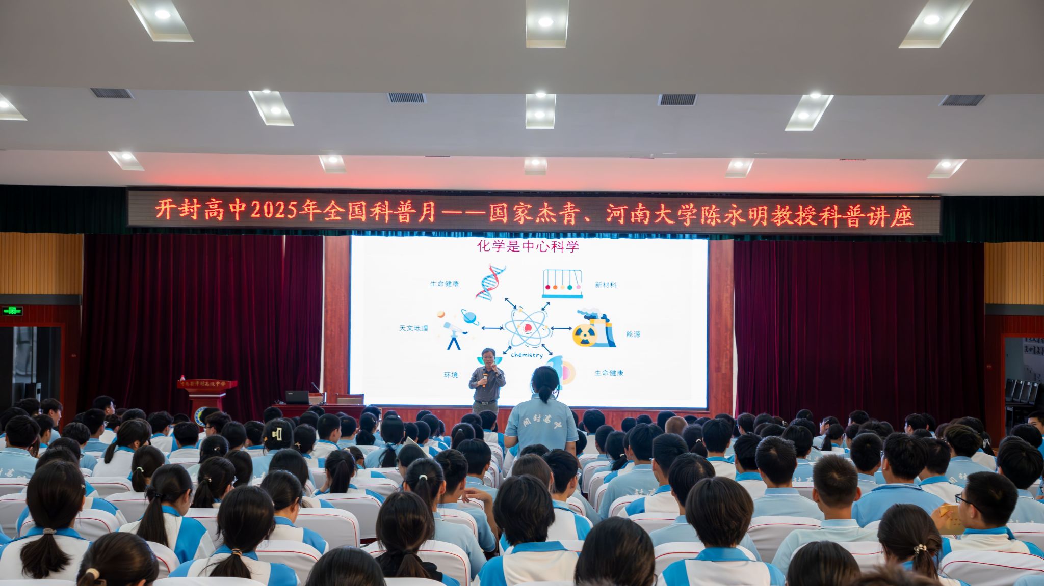 座谈会后,陈永明为高二年级学生带来题为《化学与现代科学技术》的科普报告。报告开篇明晰化学核心定义——“在分子、原子层次上研究物质性质、组成、结构与变化规律的科学”,并阐释其“中心科学”的定位:化学与物理、生物、地球科学、环境、医药健康等多学科深度交融,是连接基础科学与应用技术的关键纽带。他从微观到宏观,系统解读化学在材料科学、环境科学、能源科学及生命健康领域的应用价值与核心作用,生动展现化学对现代科技发展的支撑性意义。报告尾声的互动环节中,陈永明耐心解答学生疑问,并为人生规划提供建议,现场气氛活跃,掌声持续不断。