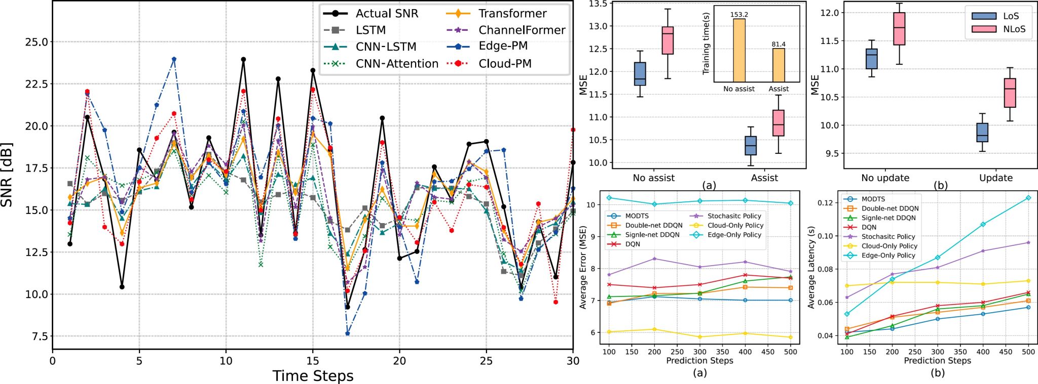 如图 3所示,该架构创新性地将计算任务在云端与边缘端进行协同分配。云端预测模型(Cloud-PM)利用多任务学习框架,对视距(LoS)与非视距(NLoS)两种异构信道进行高精度建模;边缘预测模型(Edge-PM)则通过跨层参数共享机制,在资源受限的边缘设备上实现轻量化部署与快速预测。为优化任务调度,团队进一步提出了基于双深度Q网络的多目标动态任务调度(MODTS)算法,有效平衡了预测精度与任务延迟的矛盾。实验结果表明,该架构在预测准确性、实时性能和模型鲁棒性方面均显著优于现有方法(图4所示)。