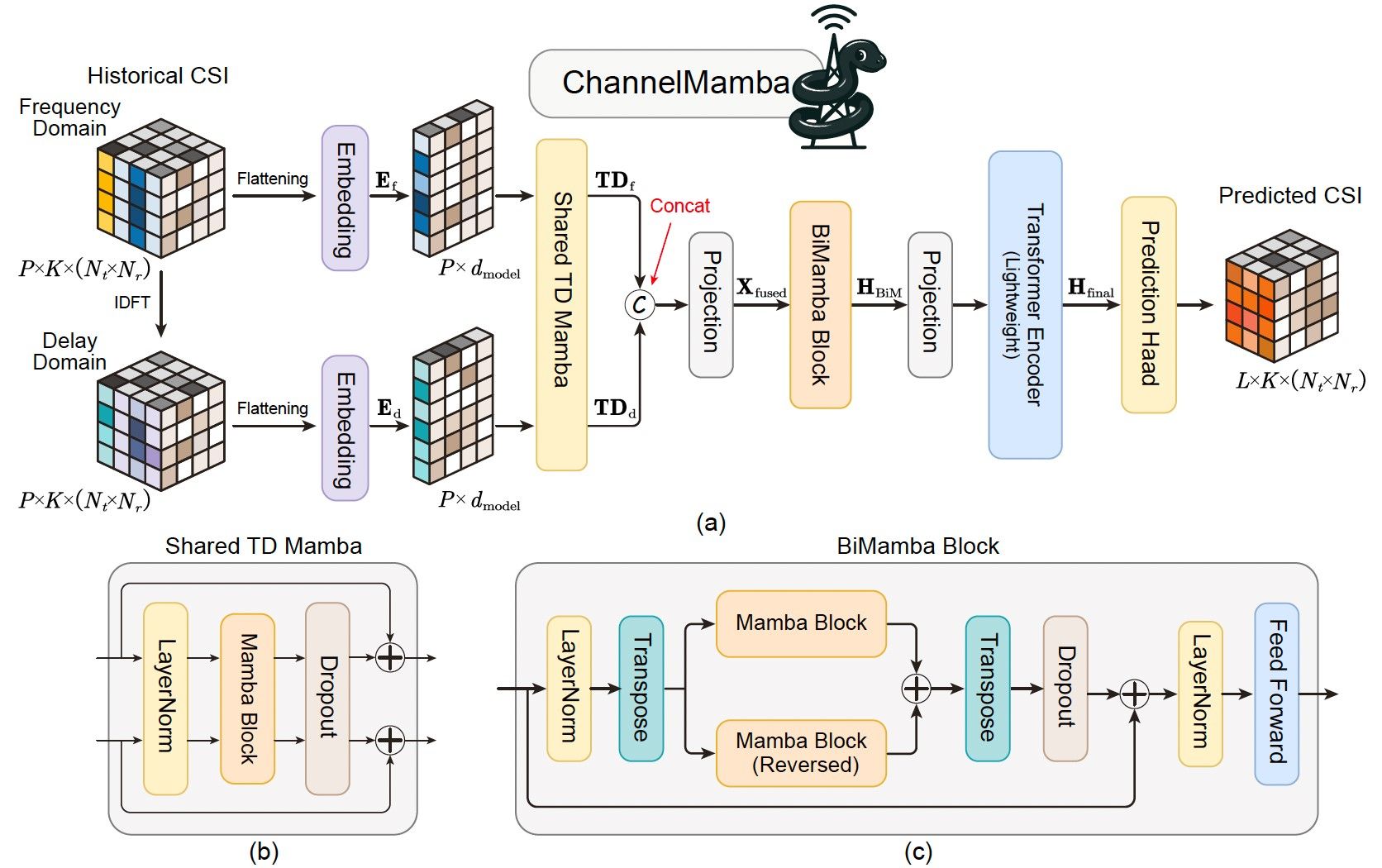 图 1: ChannelMamba 模型总体框架图(双域输入、TD-Mamba/双向Mamba、轻量注意力)