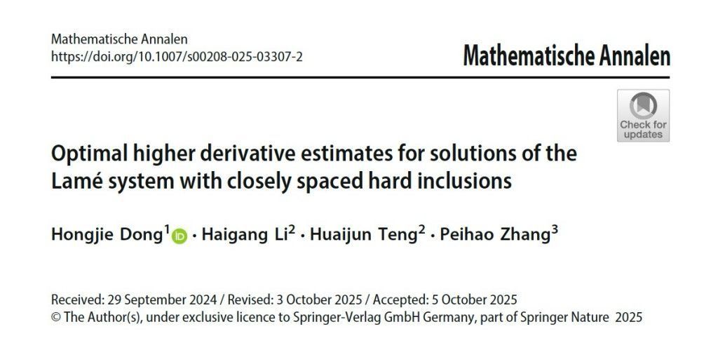 近日,我校数学与统计学院张培豪在偏微分方程与材料科学交叉研究领域取得新进展,相关成果以《Optimal higher derivative estimates for solutions of the Lamé system with closely spaced hard inclusions》为题,发表在数学领域公认的国际顶级期刊《Mathematische Annalen》上。该研究聚焦于含有紧密相邻硬夹杂的Lamé系统,建立了系统解的高阶导数的最优估计。