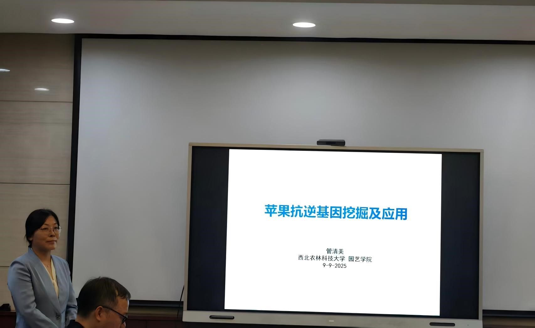 9月9日,西北农林科技大学管清美教授受邀在棉花生物育种与综合利用全国重点实验室301会议室作题为“苹果抗逆基因挖掘及应用”的科普报告。管清美教授在报告中讲述了干旱、冻寒、抗逆矮化砧木缺乏等对黄土高原产区苹果产业发展的限制。为了解决苹果产业发展的迫切需求,一方面其团队对现有苹果种质资源的抗旱、耐寒性进行了鉴定和评价,以获得抗旱、耐寒种质。另一方面,通过挖掘候选基因并解析苹果抗旱、耐寒调控网络,以创制抗旱、耐寒新种质。