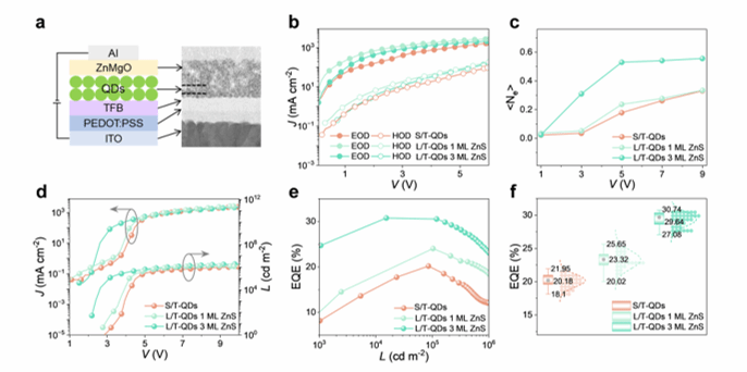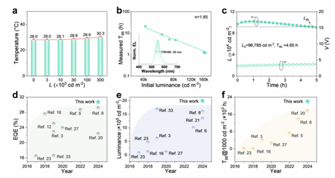 针对这一挑战,申怀彬团队与中国科学技术大学樊逢佳团队联合开展研究,利用蒙特卡罗模型深入分析QD-LED中的载流子注入与激子形成机制。模拟结果显示,提高载流子在量子点间的扩散比例可显著增强激子形成概率,尤其在较高注入电流条件下,即使轻微的点间扩散也能大幅提升激子生成效率。基于上述理论设计并构筑了具有大尺寸CdZnSe核与薄层ZnS壳的量子点结构,有效降低空穴限域能力,促进空穴在量子点之间的迁移。进一步通过壳层工程精细调控载流子限域与扩散的平衡,所制备的绿光QD-LED实现了30.7%的EQE(认证效率29.5%),最大亮度突破1.9×106 cd/m2。高效率发光也显著降低了器件发热,在1000 cd/m2亮度条件下,器件T95工作寿命长达21,900小时,创下当前绿光QD-LED领域在EQE、最大亮度及工作寿命三项关键性能指标上的最高纪录。