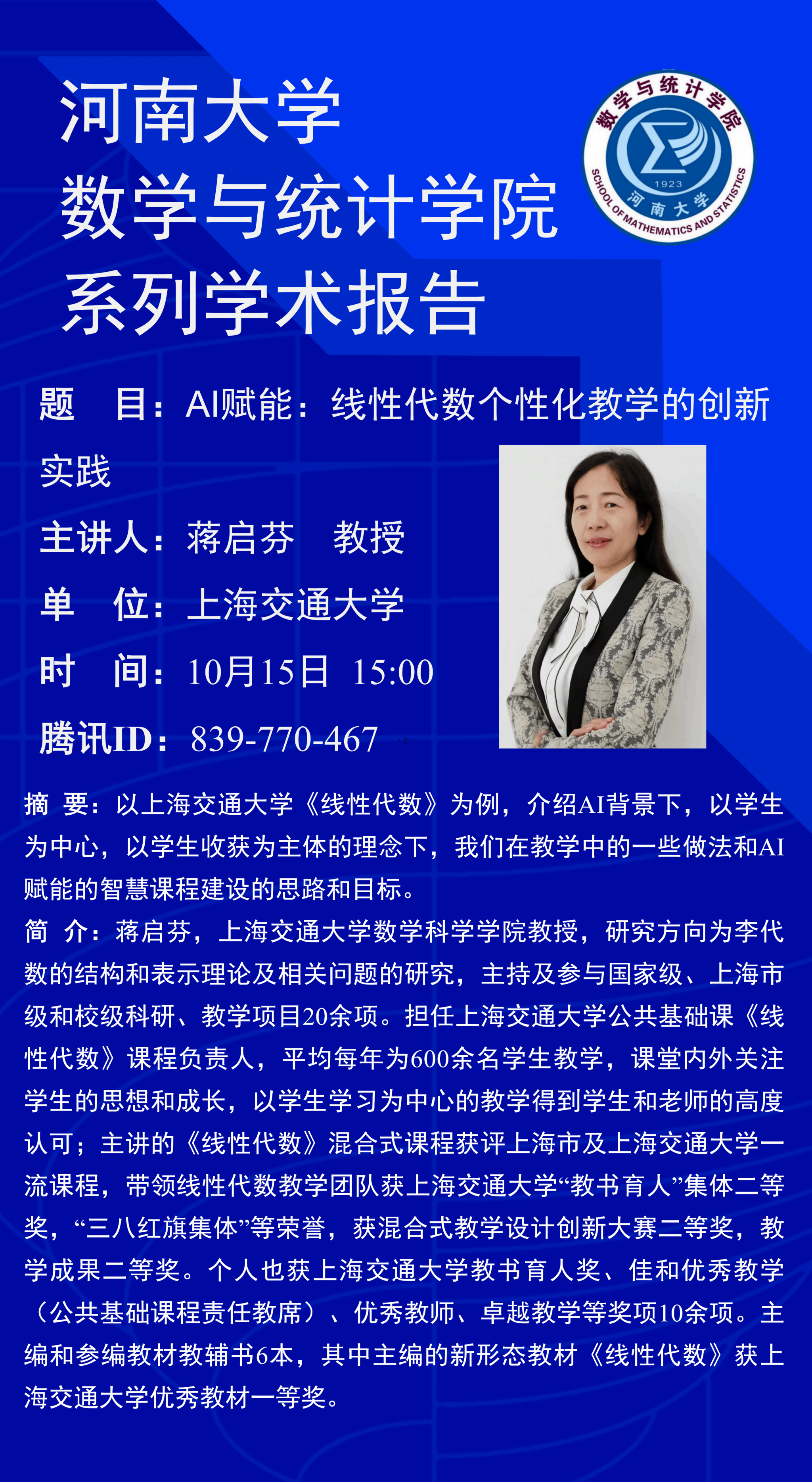 蒋启芬:AI赋能:线性代数个性化教学的创新实践(时间:10月15日)