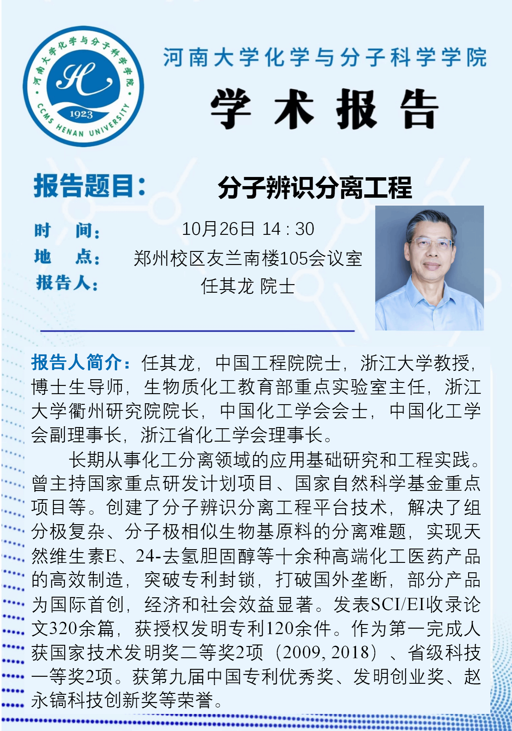 任其龙院士:分子辨识分离工程(时间:10月26日)