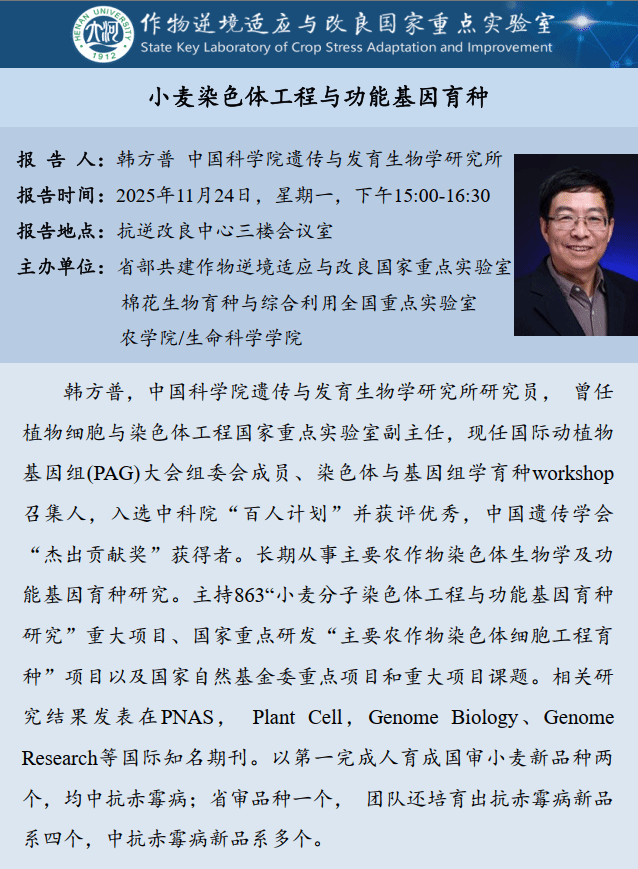 韩方普:小麦染色体工程与功能基因育种(时间:11月24日)