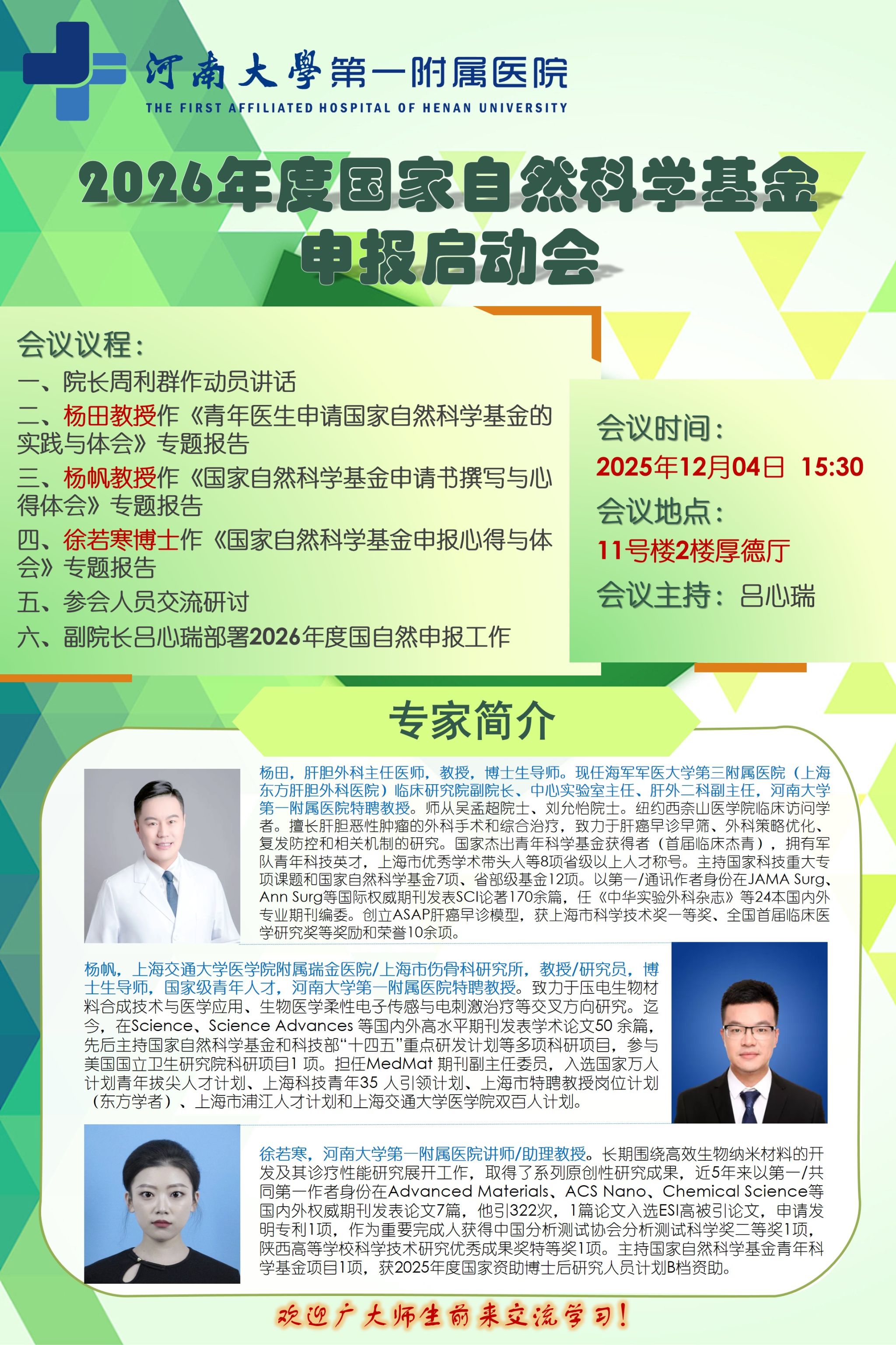 河南大学第一附属医院2026年度国家自然科学基金申报启动会(时间:12月4日)