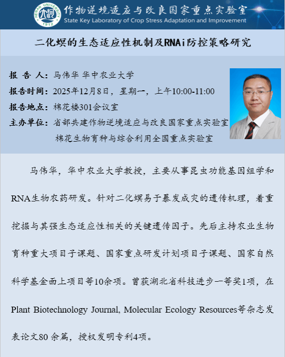 马伟华:二化螟的生态适应性机制及RNAi防控策略研究(时间:12月8日)