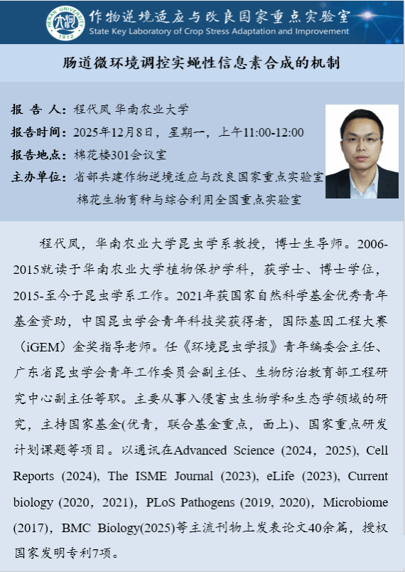 程代凤:肠道微环境调控实蝇性信息素合成的机制(时间:12月8日)