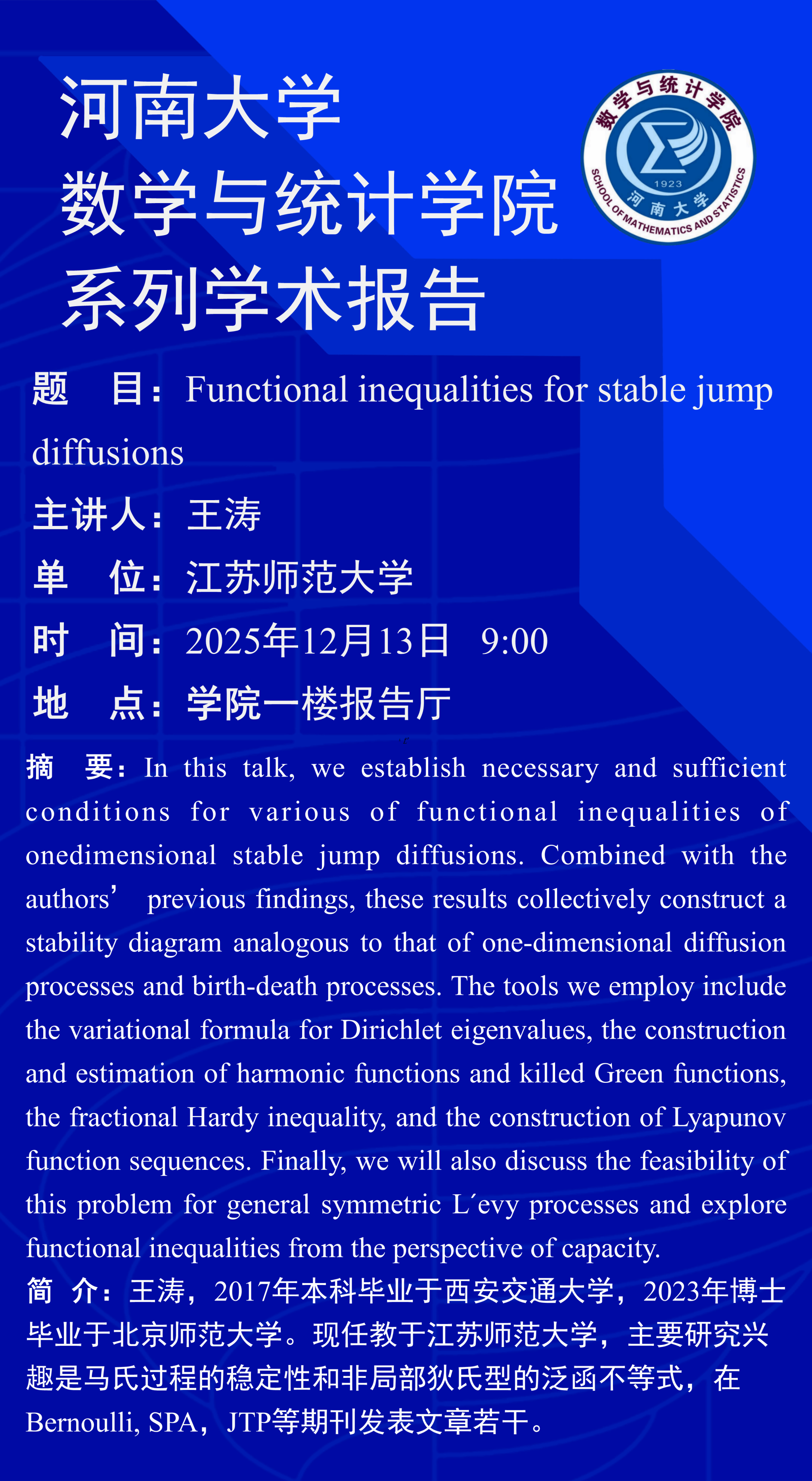 王涛:Functional inequalities for stable jump diffusions(时间:12月13日)