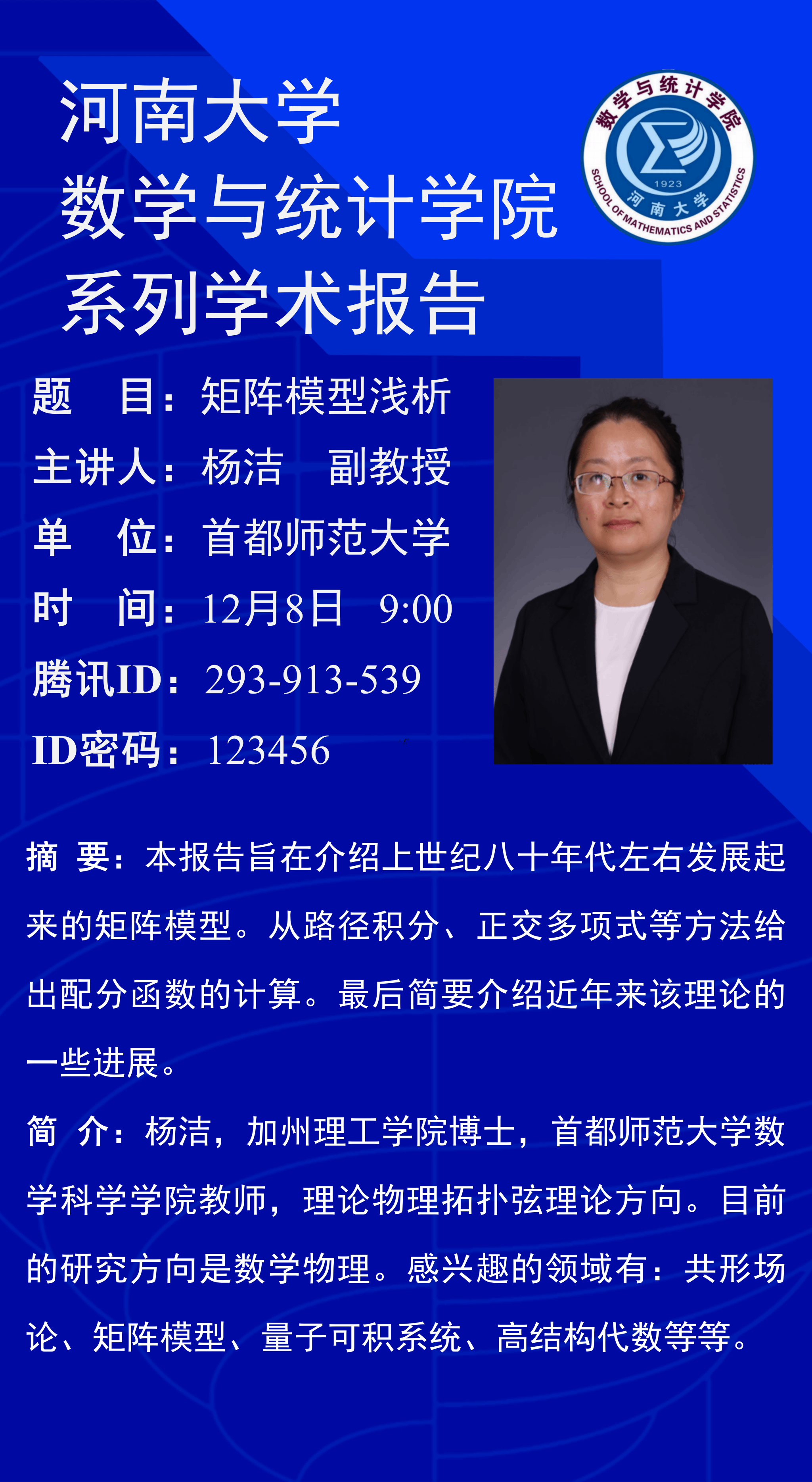 杨洁:矩阵模型浅析(时间:12月8日)