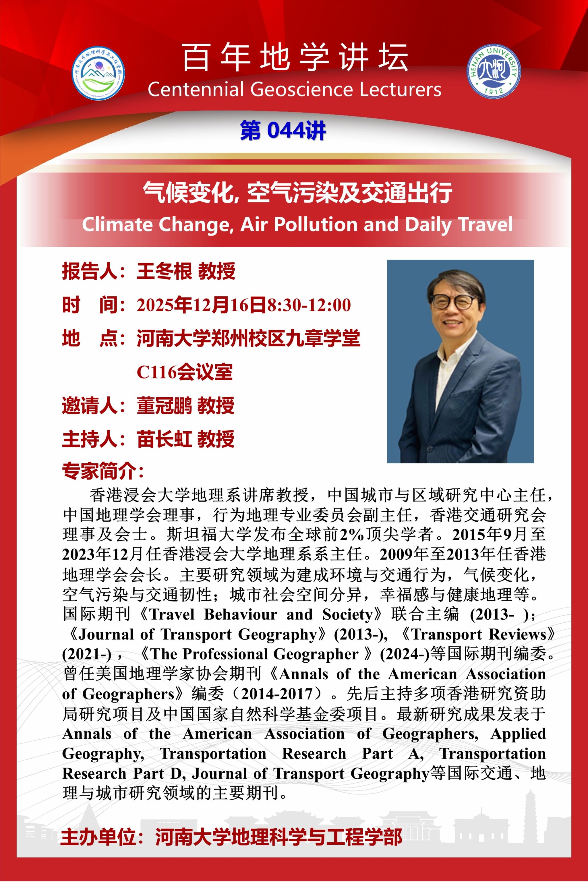 王冬根:气候变化, 空气污染及交通出行(时间:12月16日)
