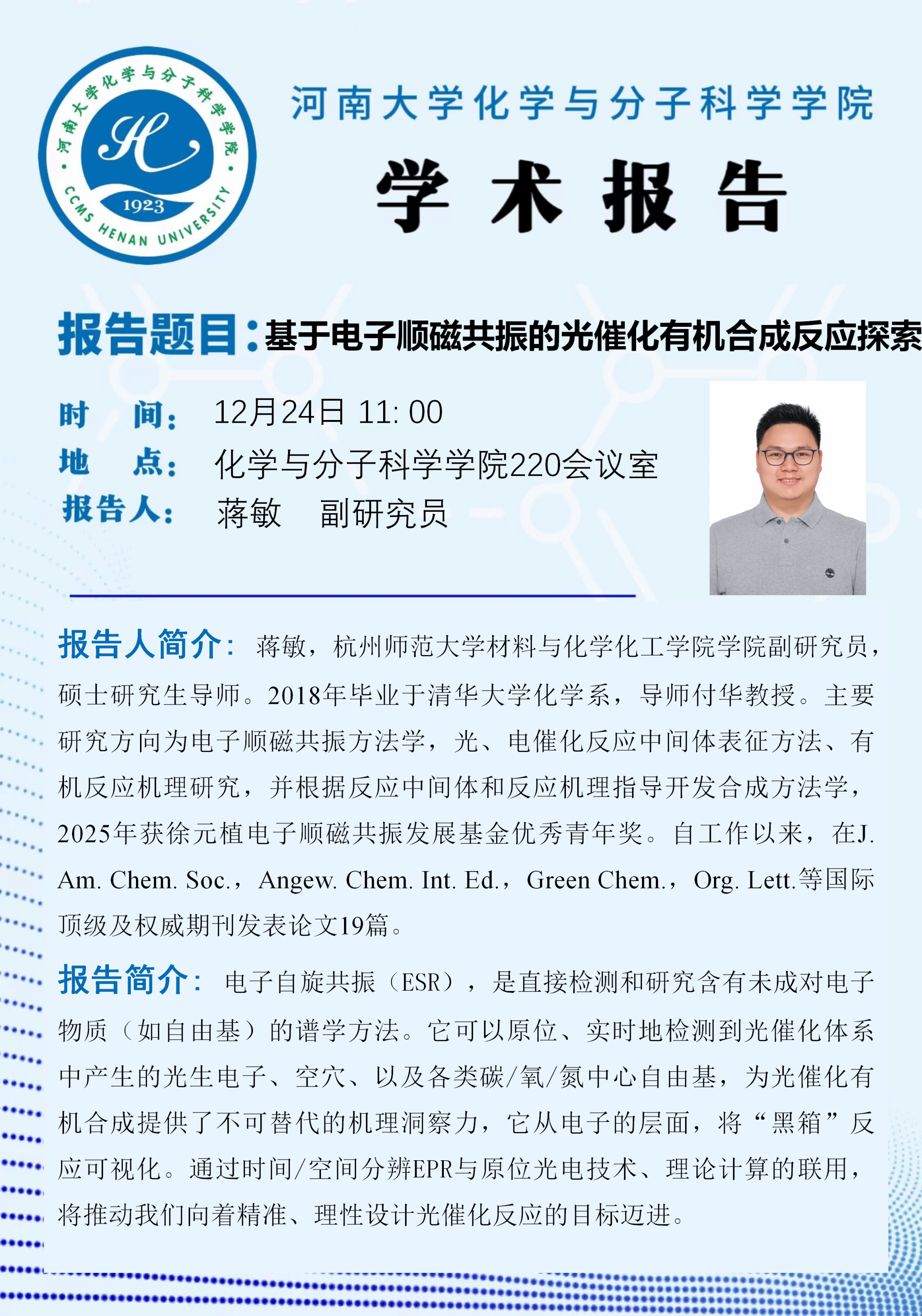 蒋敏:基于电子顺磁共振的光催化有机合成反应探索(时间:12月24日)