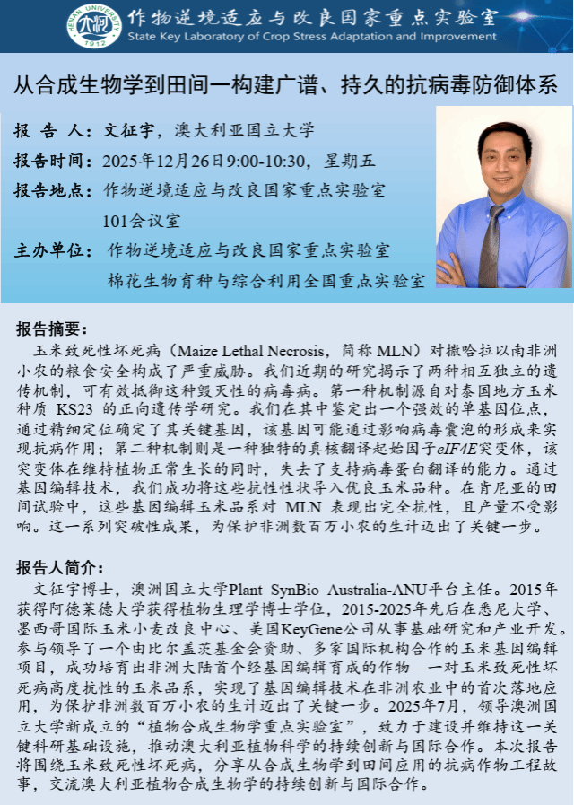 文征宇:从合成生物学到田间一构建广谱、持久的抗病毒防御体系(时间:12月26日)