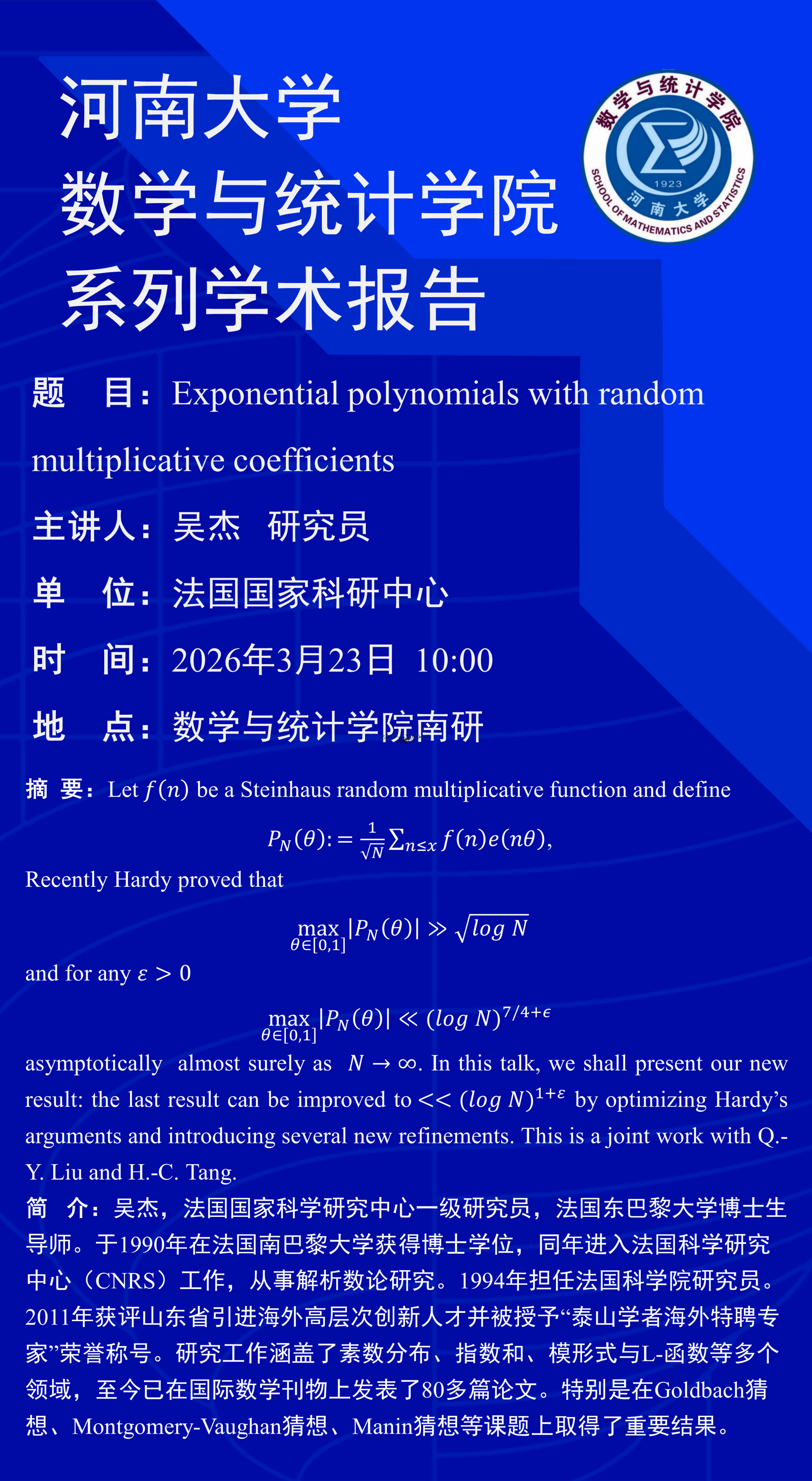 吴杰:Exponential polynomials with random multiplicative coefficients (时间:3月23日)