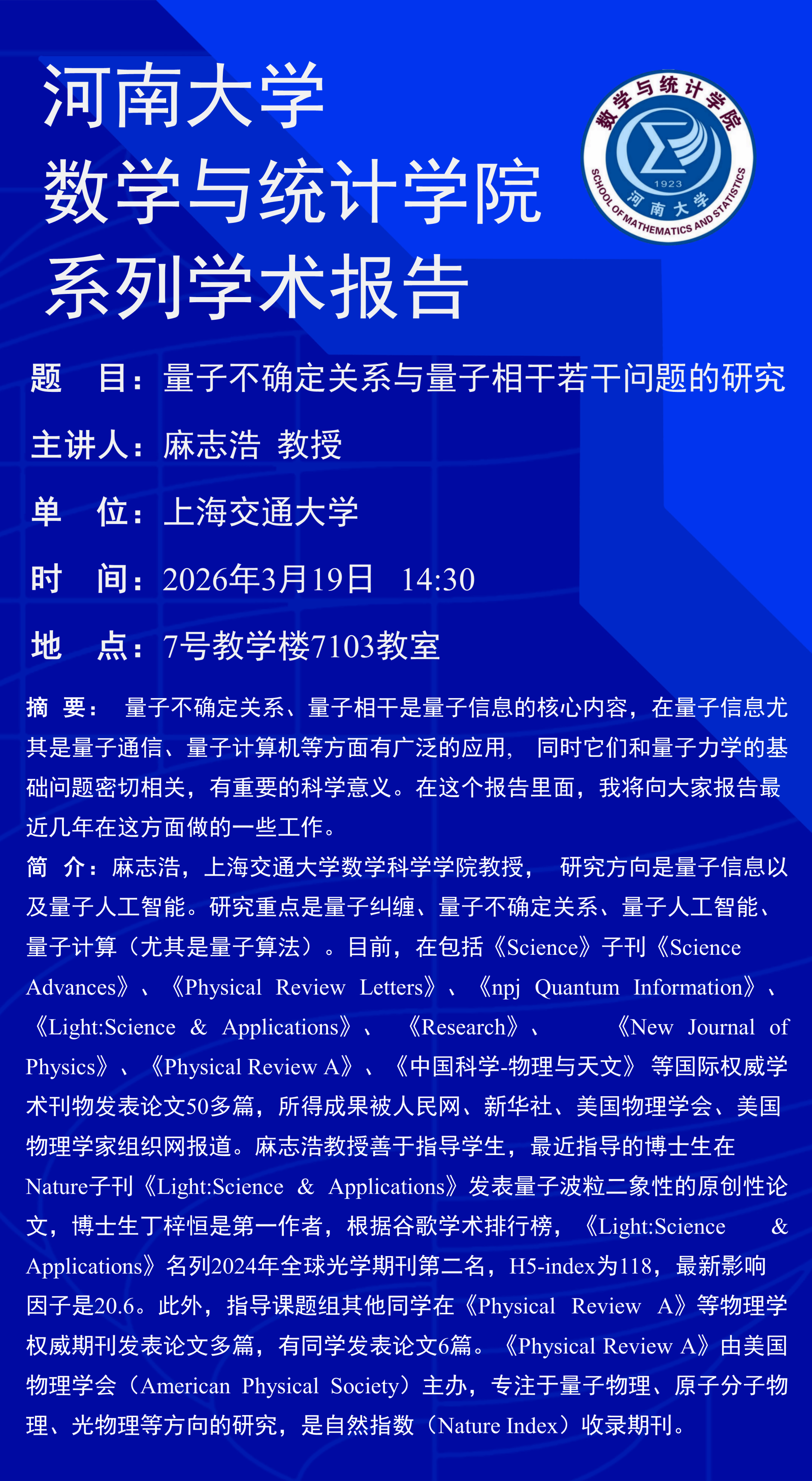 麻志浩:量子不确定关系与量子相干若干问题的研究(时间:3月19日)