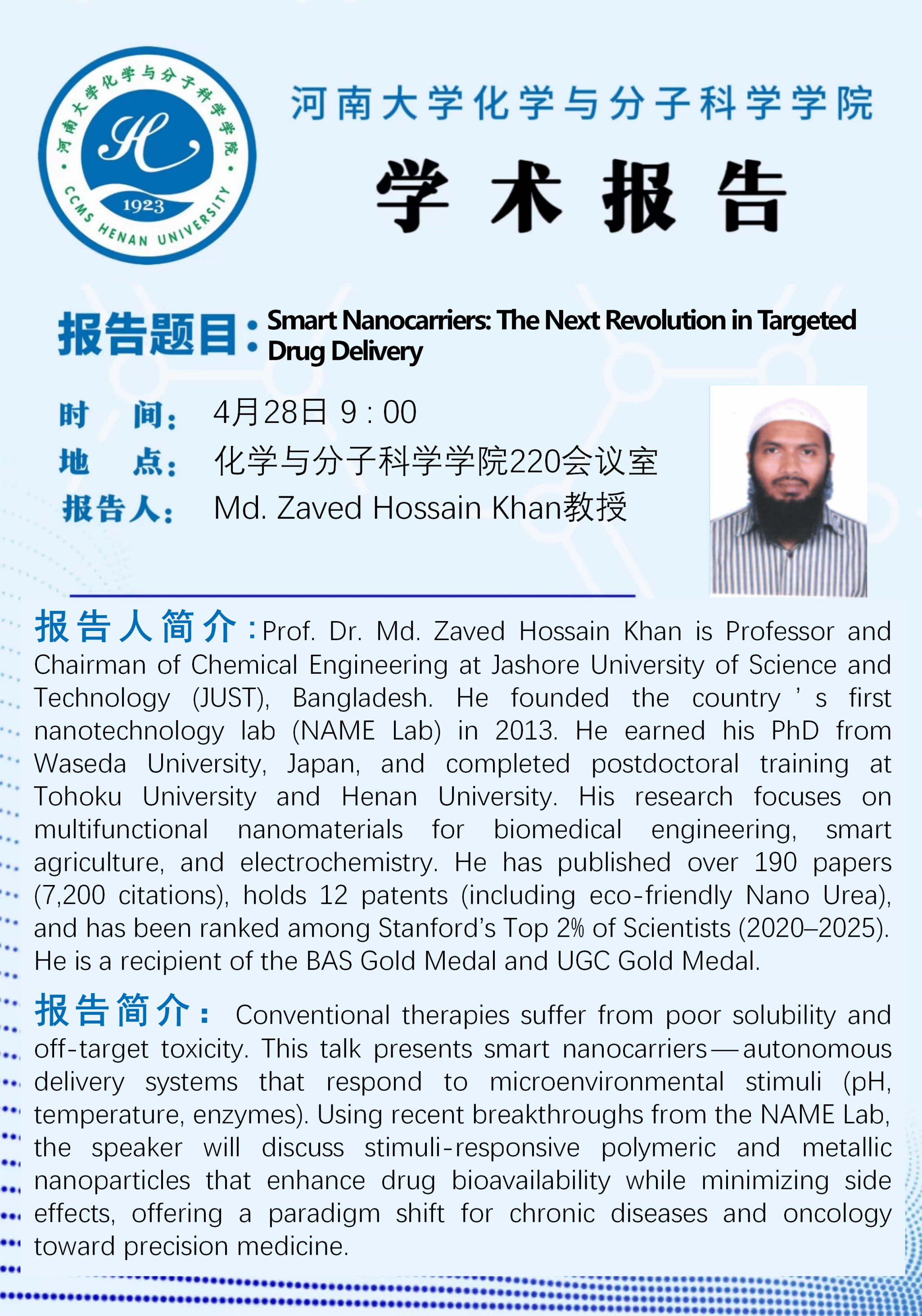Md.Zaved Hossain Khan:Smart Nanocamiers: The Next Revolution in Targeted Drug Delivery(时间:4月28日)