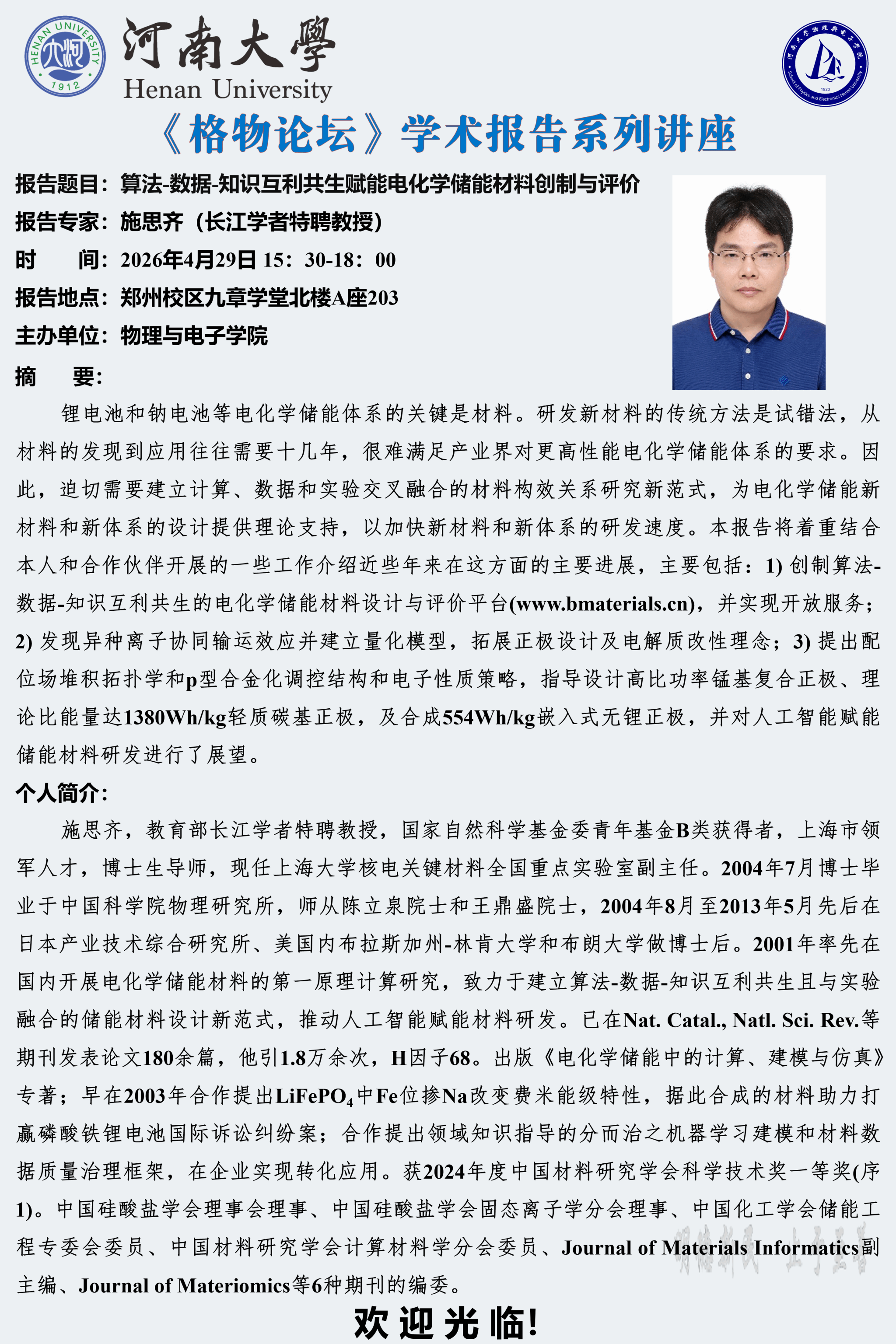 施思齐:算法-数据-知识互利共生赋能电化学储能材料创制与评价(时间:4月29日)